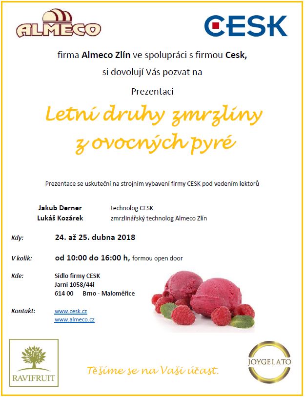 Rádi bychom Vás pozvali na dny otevřených dveří naší provozovny v Brně. Budeme pořádat prezentaci "Letní druhy zmrzliny z ovocných pyré" ve spolupráci s firmou Almeco.