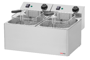 Obsah oleje 2 x 7-8 l; celonerezové provedení; spec. úprava nerezové topné spirály; studená zóna; síťový vypínač; kontrolka chodu a vyhřátí; regulace teploty 50-190° C; rozměr koše: 2 x 21 x 23,5 x 10 cm.