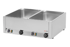 2x vana pro GN 1/1-150 h; regulace teploty 30-90° C; kontrolka zapnutí a vyhřátí lázně; topné těleso pod dnem vany; rozváděcí deska mezi tělesem a vanou; samostatné ovládání pro každou vanu.